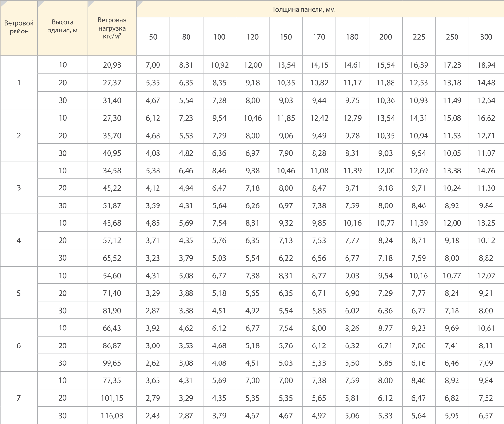 8.7.1 Максимальный пролет крепления стеновых панелей для местности типа В